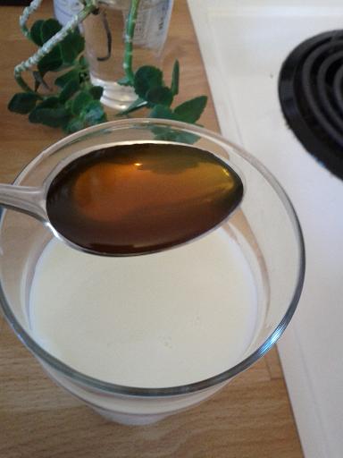 Vous mettez 2 – 3 cuillerées de sirop (brunâtre) dans votre lait.