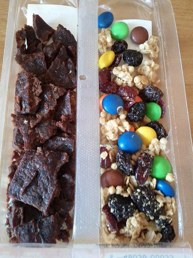C’tu bon? Correct, sans plus! J’ai déjà mangé mieux en terme de jerky. Les M&M c’est pas des vraies pis ils goûtent la paraffine. Pis les raisins secs sont vraaaaaaiment sec. Pis le granola y’est ben correct sauf qu’il goûte rien!