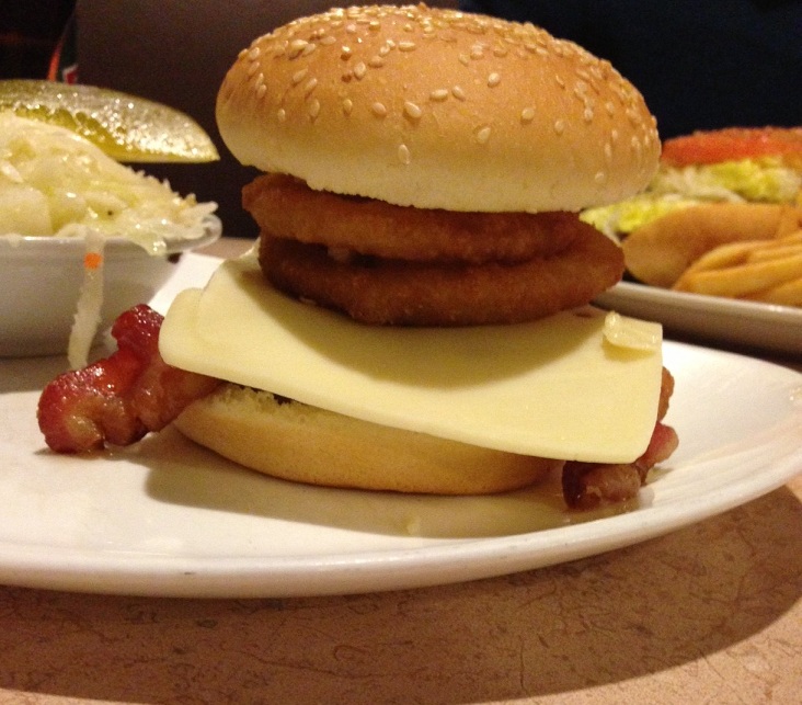 Star Burger : Boulette de boeuf (Nice!), fromage cheddar en tranche (Brwoooooooop), bacon (YES!), niononne rigne (OUH LA LA LA LA!) et FRÔMÂGE EN GRAINS???? (*plick* *plick* *plick* (bave qui coule))