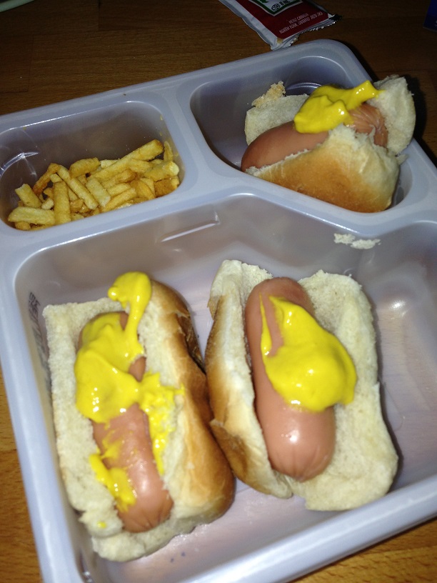 Beau kit! Trois p’tits pains + trois p’tites soucisses + un mini motton de juliennes + un sachet de ketchup + un sachet de moutarde.