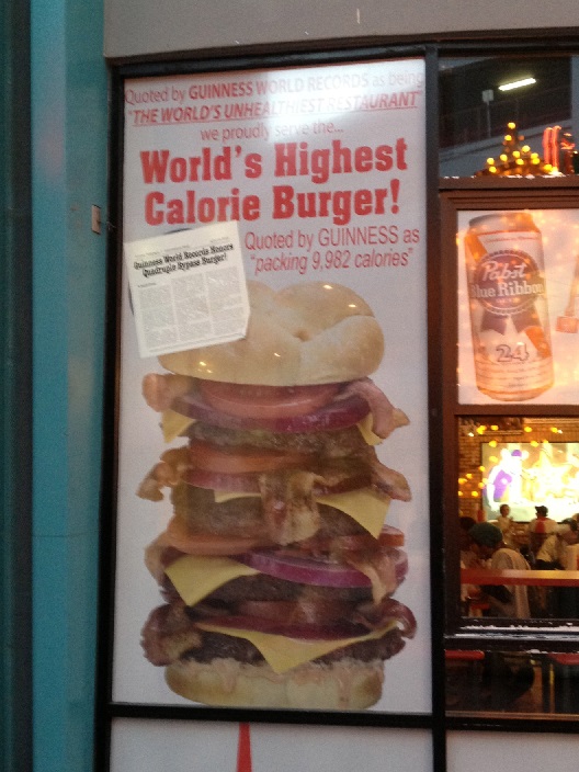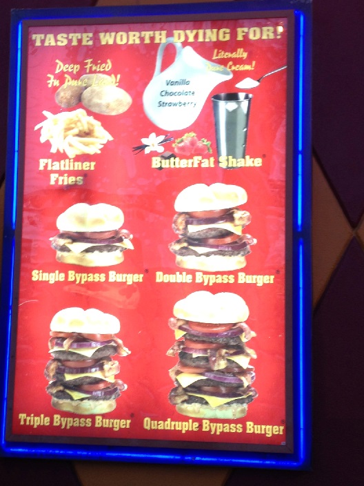 Entre autres, nous sommes passés devant le fameux Heart Attack Grill où le client qui pèse plus de 350 lbs peut manger gratuitement (on peut se peser à l’entrée) et où les serveuses sont habillées en infirmières (only in America…).