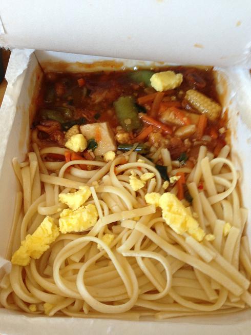 C’pas un pad thaï ça… C’t’un spag sucré au poulet, avec des chunks de maïs et un restant d’oeufs brouillés…