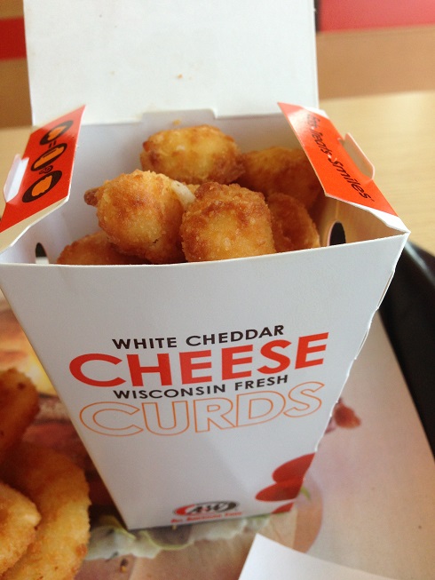 Loin d’avoir très faim, je me commande, tel que promis à moi-même, des « fried cheese Curds »… Ça et une petite rondelle d’oignons feront office de déjeuner / dîner.