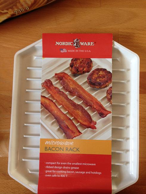 Sinon, j’ai dégoté une assiette pour cuire le bacon au micro-ondes (je travaille sur une semaine spéciale « gadgets de cuisine »… Je vous reviendrai là-dessus!).