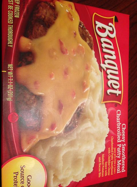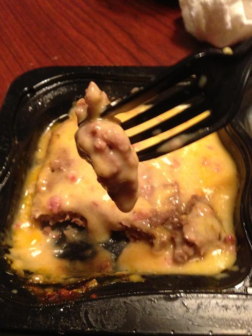 -Le nom : Y’a vraiiiiiiment trop de mots dans ce nom-là… C’est comme un faux-fuyant pour nous faire oublier que c’est une boulette de porc ET de dinde (quelles parties de l’animal? On ne le saura jamais!). CHEESY! SMOTHERED! CHARBROILED! Patty meal?