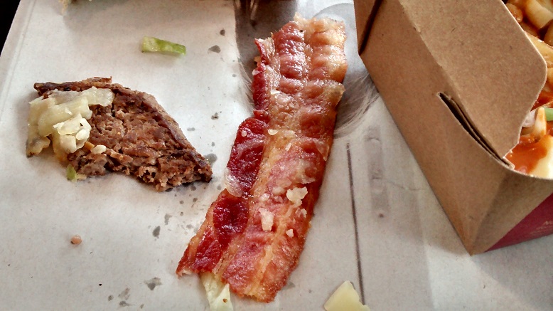 La sauce à poutine « normale » se trouve sous la poutine, dans le fond de la barquette en cartron… Weird et complètement indigeste!