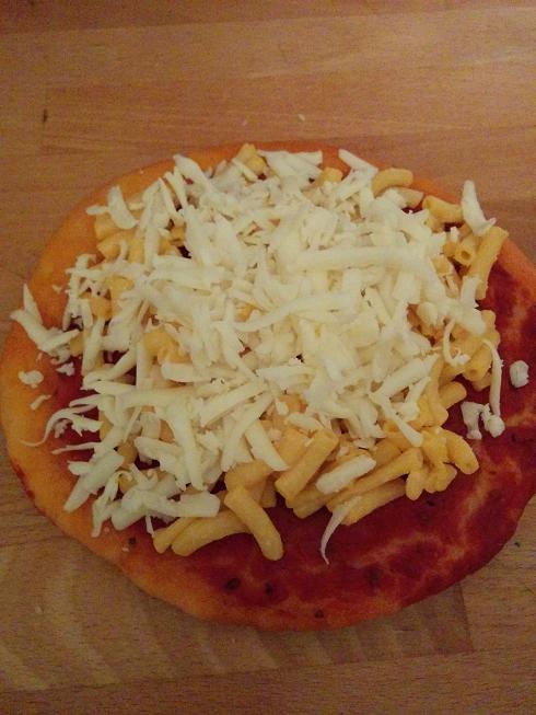 Déposez le macaroni sur la pizza pas de fromage de bord de comptoir de dépanneur et ensuite déposez le fromage fraîchement râpé sur le macaroni (Bien respecter ces étapes, car terminer par la pizz pas de fromage de bord de comptoir de dépanneur serait une catastrophe assurée)