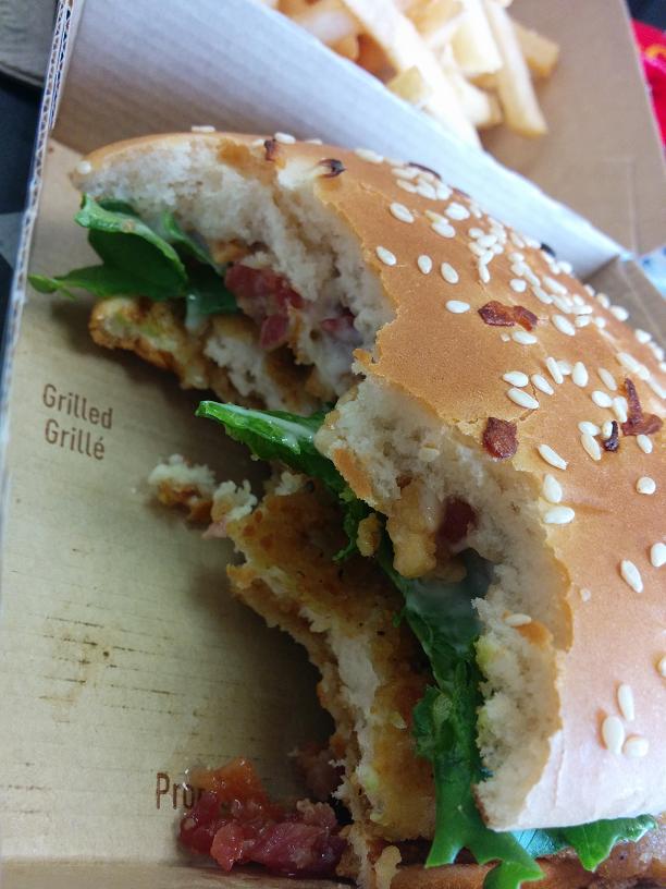 Un bon gros pain moelleux, une « slab » de chicken digne d’un MacPoulet, les oignons sont bons dans le gorgoton et le bacon, grâce au saupoudrement sur le pain, est présent à chaque bouchée!