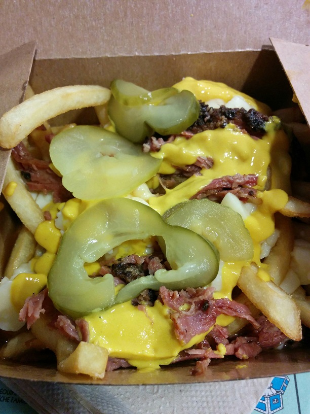 Quelle idée de m4rd3… On va faire une poutine au Smoked Meat, alors on va cr!$$3r l’entièreté d’un sandwich au smoked meat sur une pout’… En l’occurrence : la viande, les pickles pis LA PHOQUING MOUTARDE!?!?!?!?