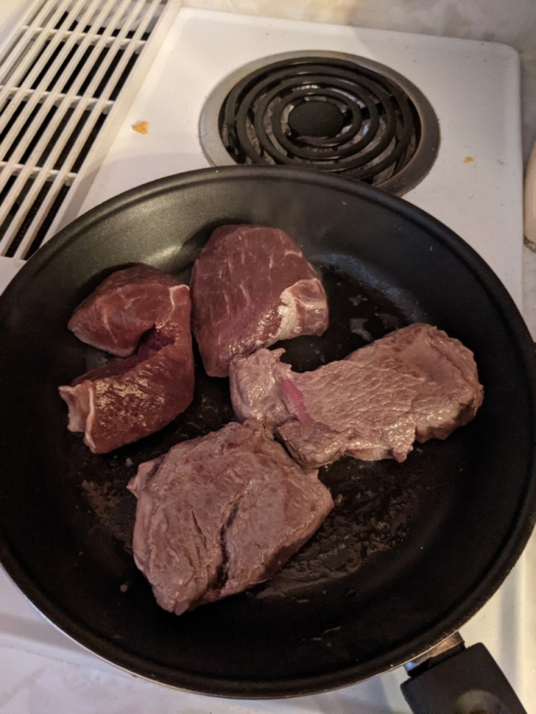 Là tu ne le vois pas mais les steaks passent de rouge brun foncé à gris béton dans le temps de le dire…