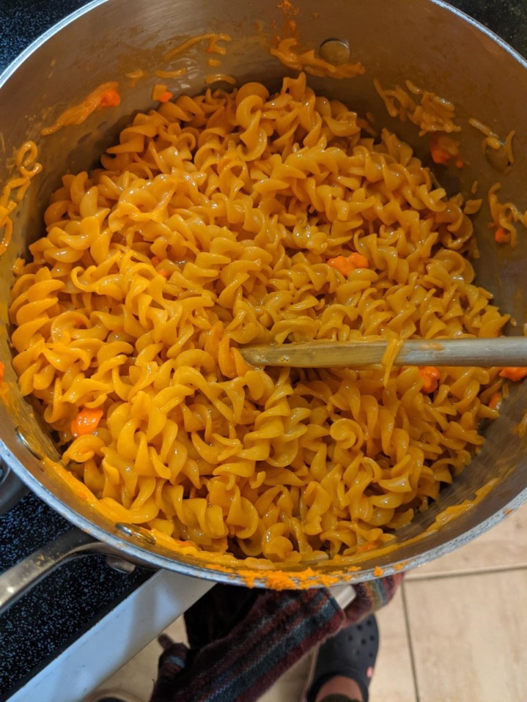 Sans grande surprise ça se prépare EXACTEMENT comme un Kraffedineur régulier en chauffant les pâtes et en ajoutant du beurre / du lait / la poupoud’ fromagée et ça donne la photo qui suit…