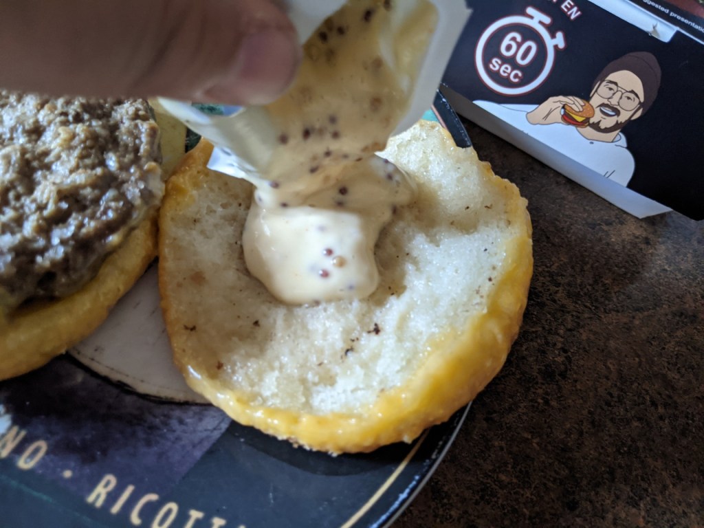 On déverse la sauce moutardée à l’intérieur du burger du Grand Sorcier de la Douche-itude dont la formule magique est ‘Une Grainune de Dewshune Qui Grattune Stune Maladiune Veneriune’…