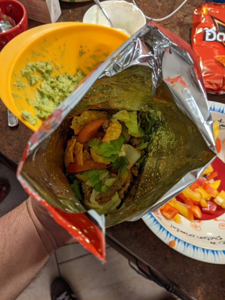 Et au lieu de préparer des coquilles / des tortillas, tu crisses ça DANS UN SAC DE DORITOS!!!!! *Bruit d’explosion de cerveau