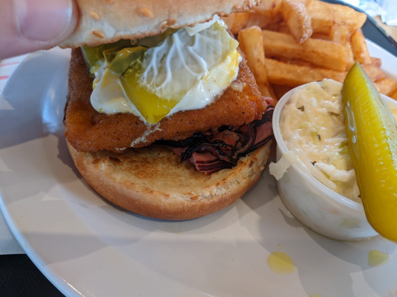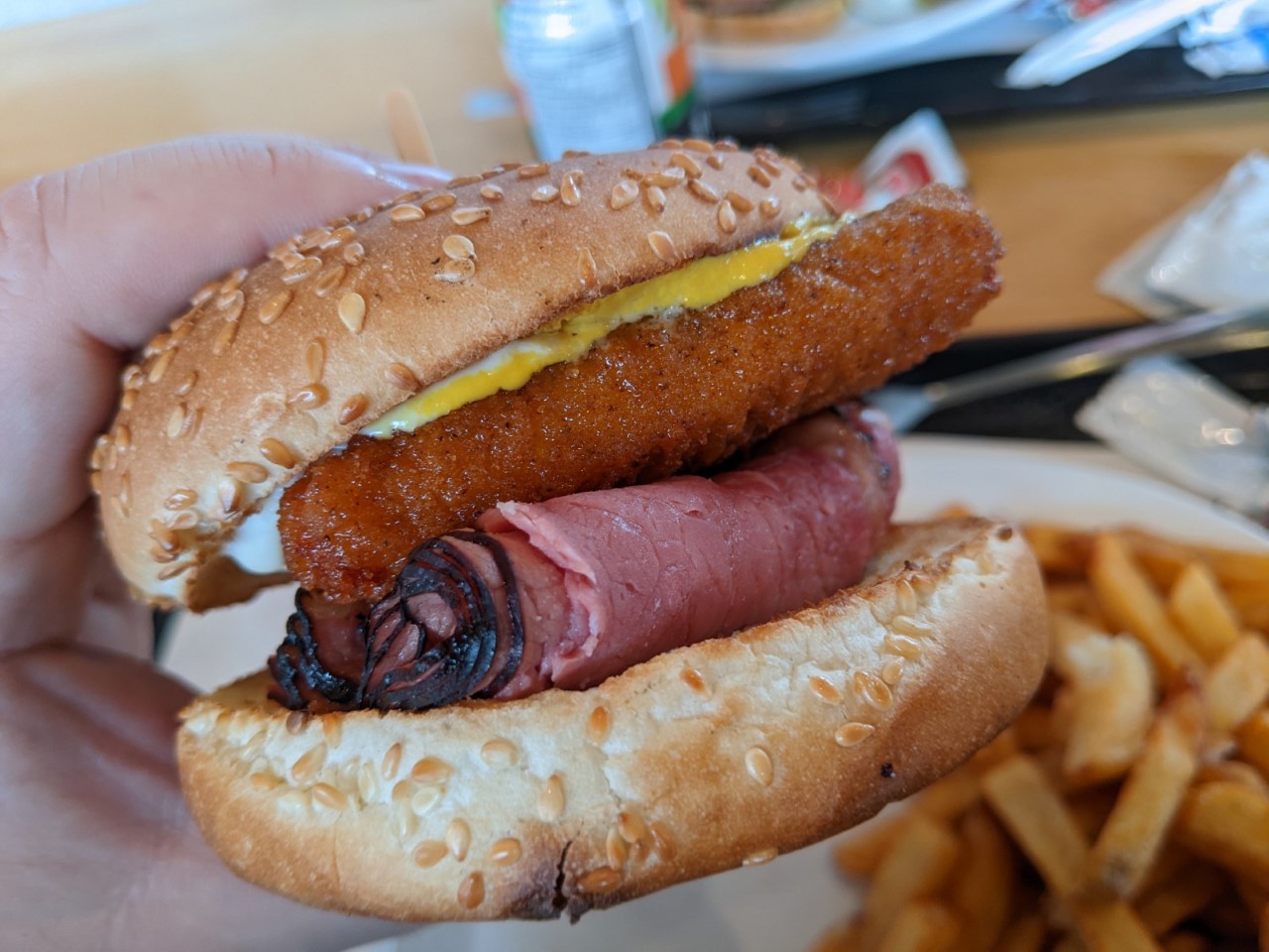 On peut remarquer la présence sur le pain (brioché (rien de moins)) ET de graines de sésame ET de graines de pavot : comme un pansexuel dans un sauna, TOUTES LES GRAINES SONT BIENVENUES! (Excusez-la!)